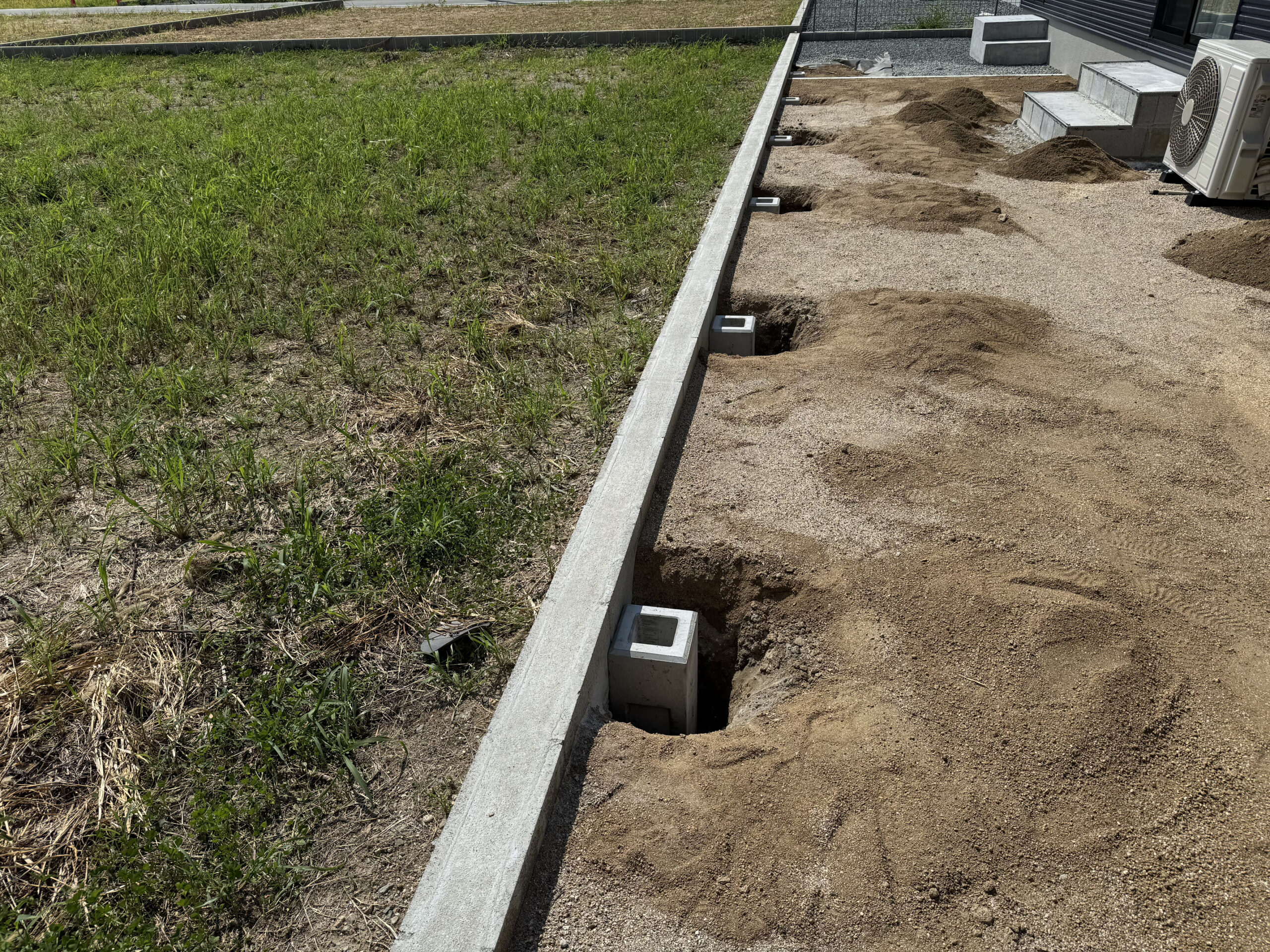 フェンスを設置する前の境界付近。独立基礎を埋め込み、長くお使いいただけるフェンスを立てていきます。