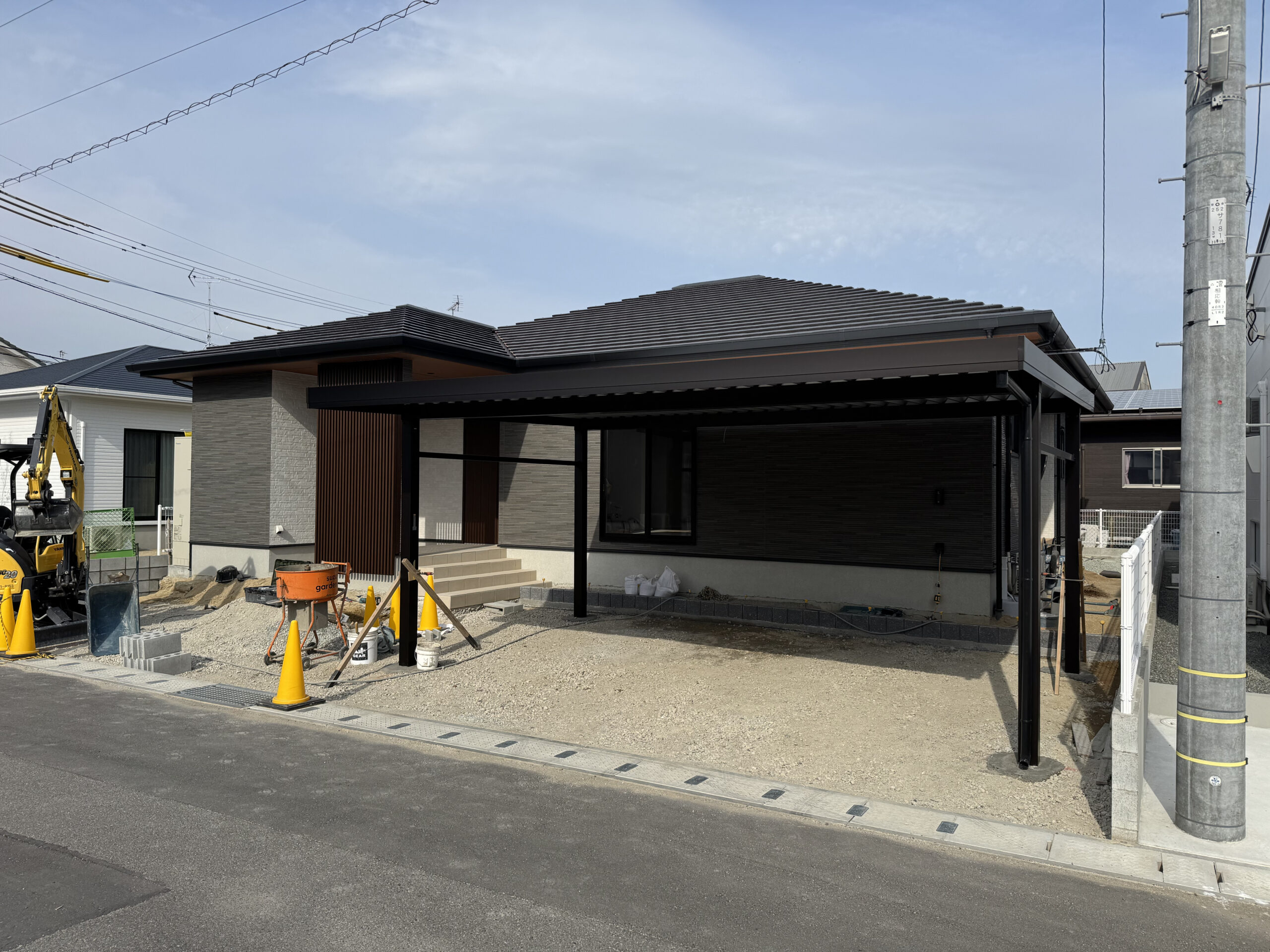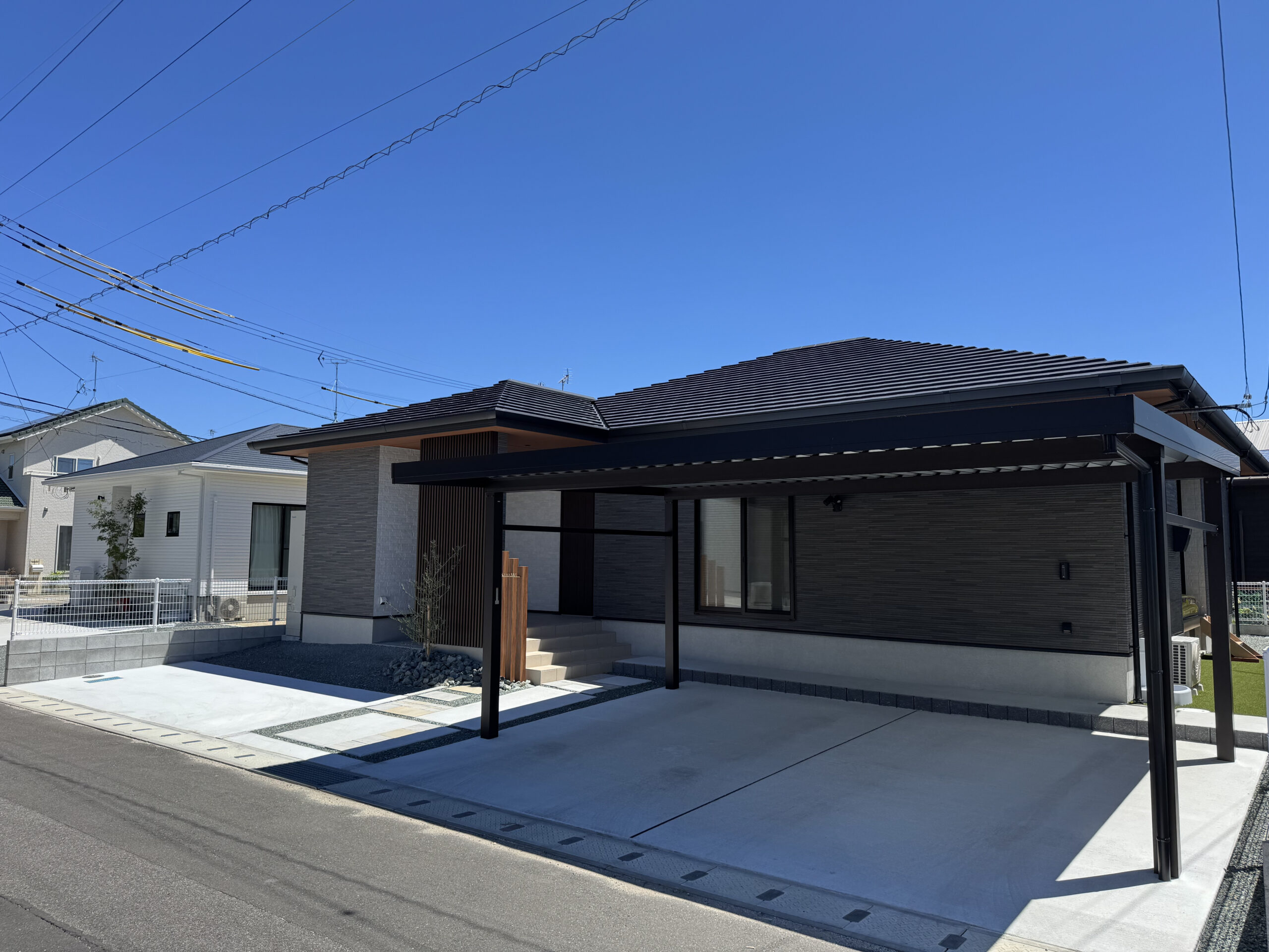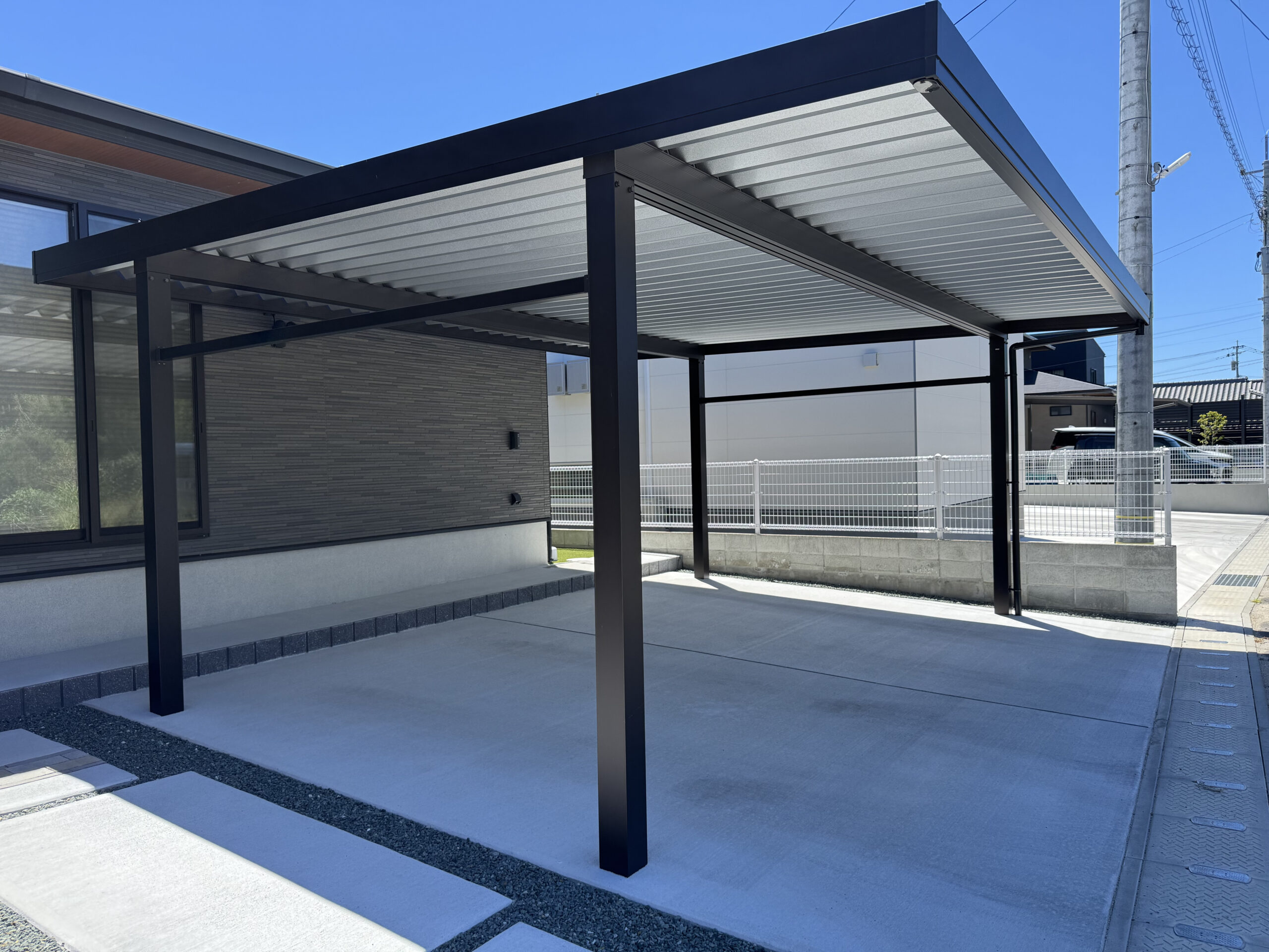存在感のあるブラックのカーポートを設置。建物とトーンを完璧に合わせることで、住まい全体の風格が一段と上がりました。
