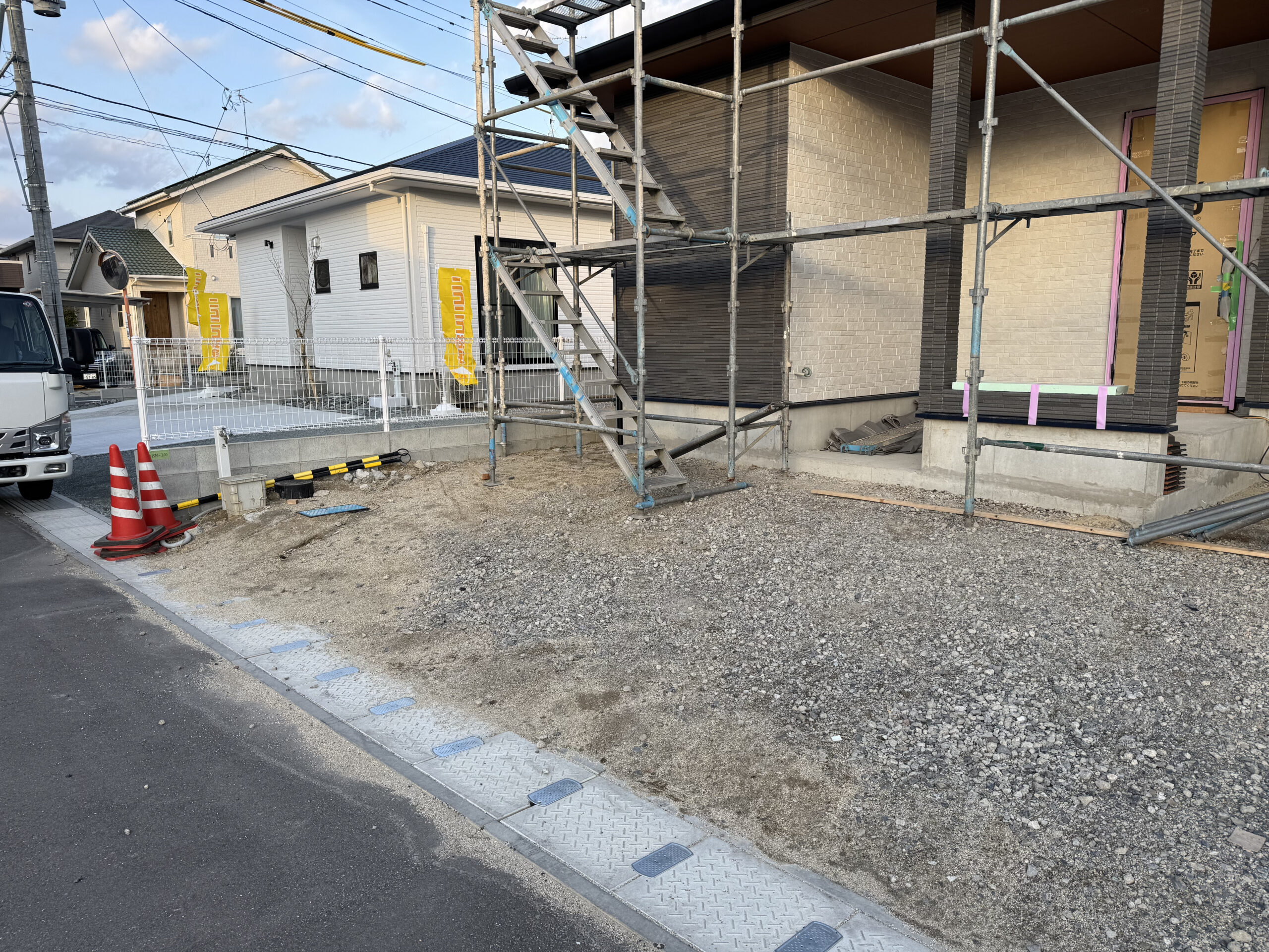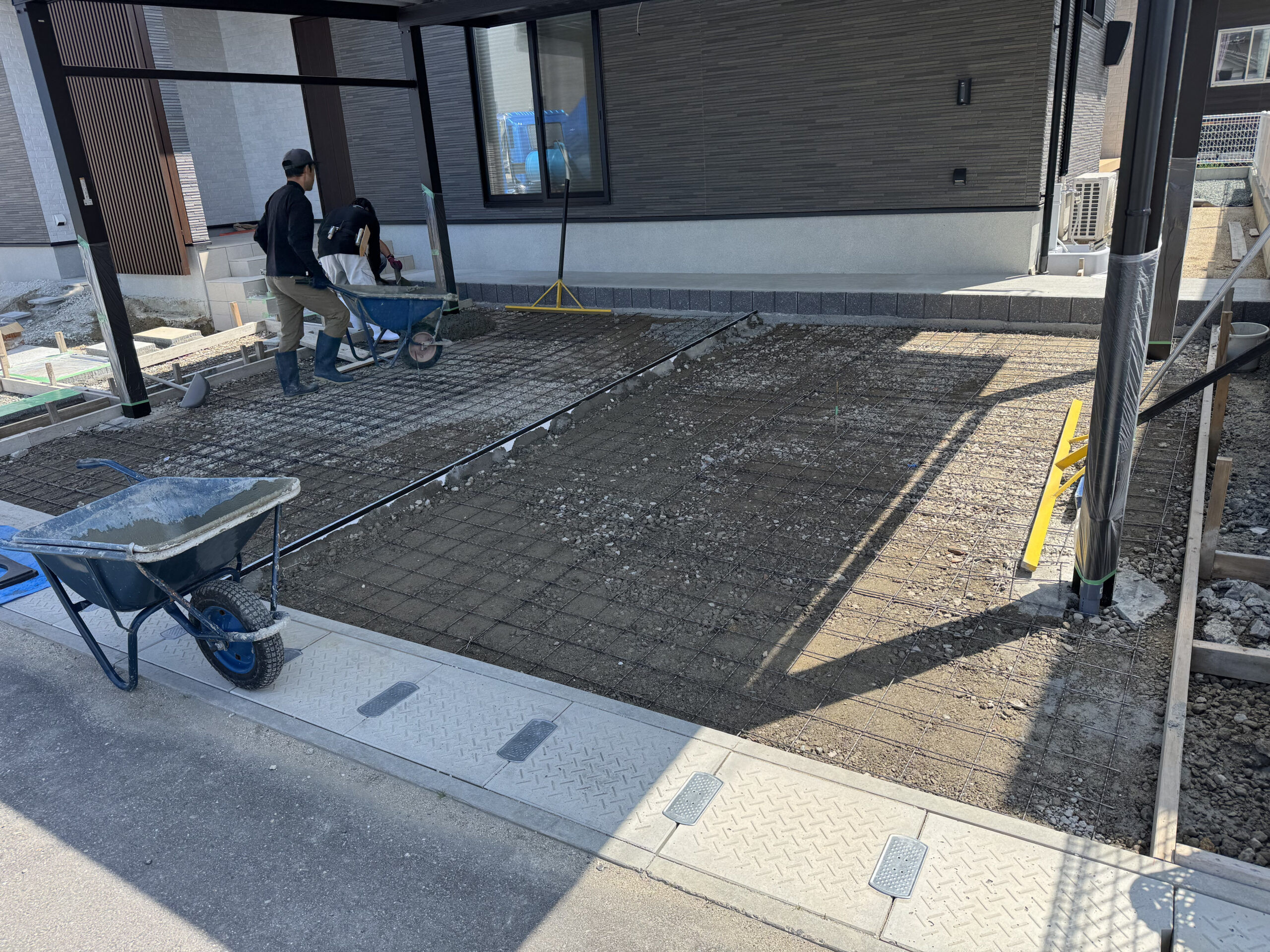 玄関前の工事中の様子。ここが家の「顔」となるため、素材選びと配置にこだわりました。