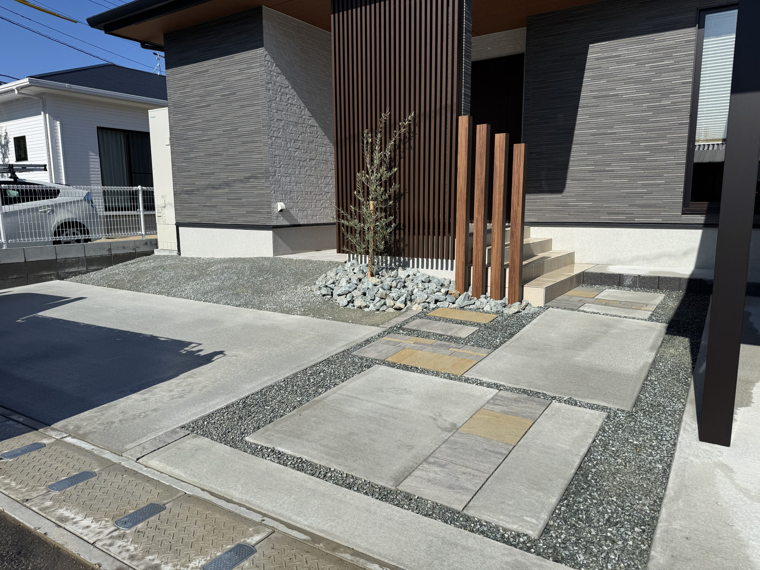 新築の外構プランとして、建物の重厚感に負けないダイナミックな空間デザインをご提案しました。