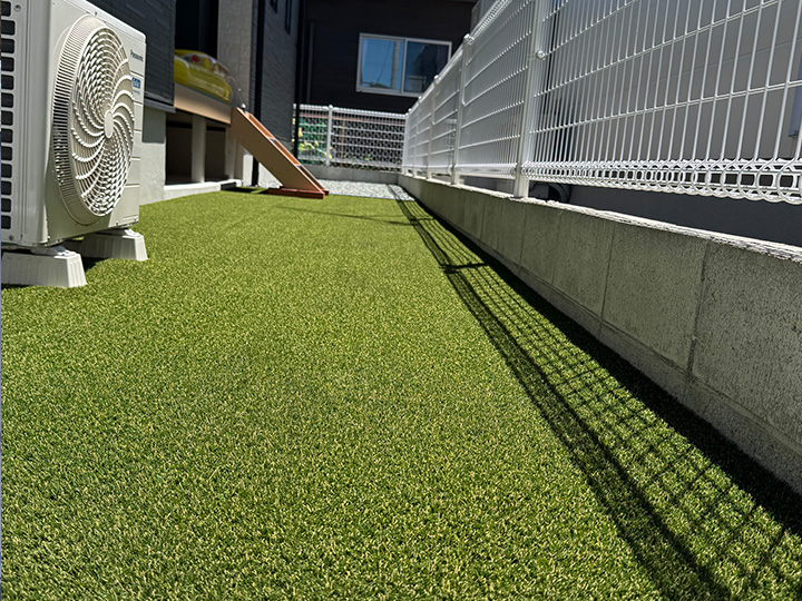 高品質な人工芝を敷き込み、一年中緑が映える空間に。防草対策も万全で、お子様の遊びスペースも確保でき日々のお手入れを最小限に抑えています。