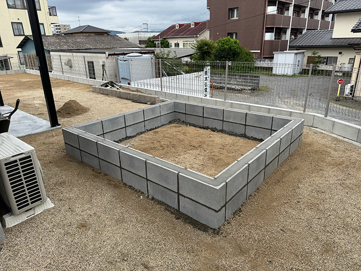 重厚感のあるブロック積みの立ち上げ花壇を新設。お手入れがしやすいだけでなく、お庭に奥行きと洗練された印象を与えています。