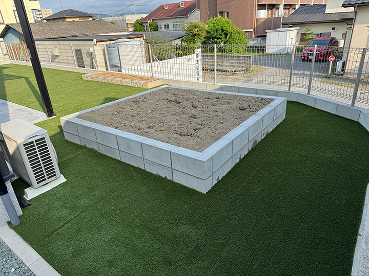 お庭の大部分を高品質な人工芝にすることで、草むしりの手間をゼロにしつつ、お子様やペットが安心して遊べるクッション性を確保。お庭のアクセントとして設置したブロック積みの花壇は、腰に負担をかけずにお手入れができる高さを計算して設計しました。