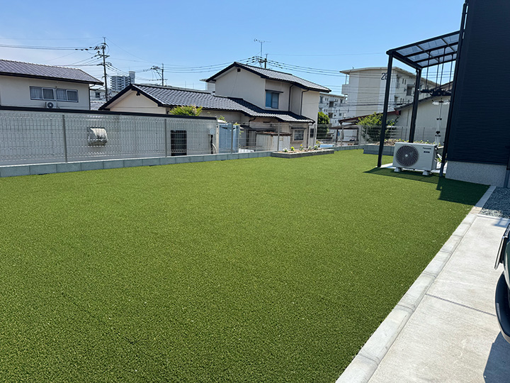 隅々まで人工芝を敷き詰め、一年中緑が映える美しいお庭へ。泥跳ねの心配もなく、お子様とサッカーを楽しむ事が実現しました。 人工芝の下は全面防草シートを敷き込みます。