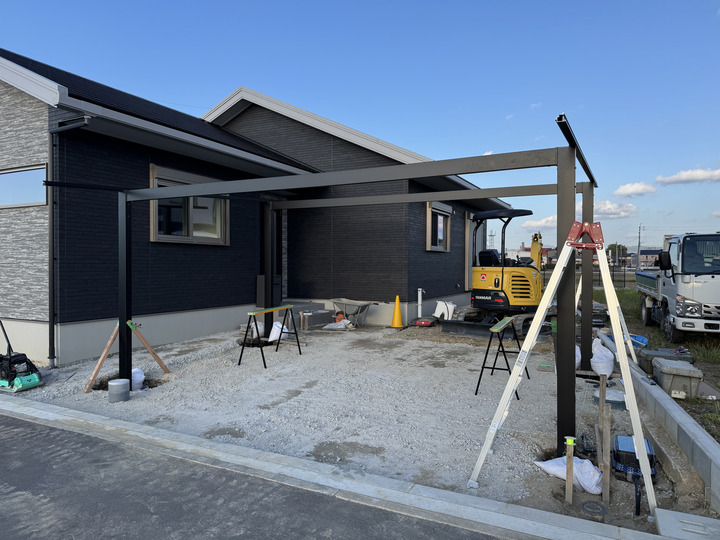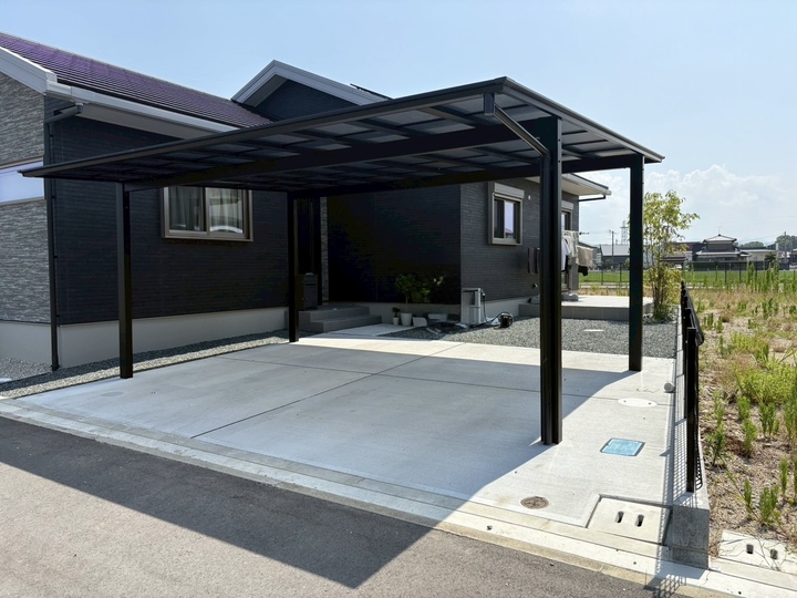 建物と調和する黒のカーポートを設置。足元は全面土間コンクリートで仕上げ、機能性とデザイン性を両立させた駐車スペースとなりました。
