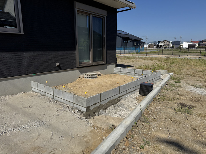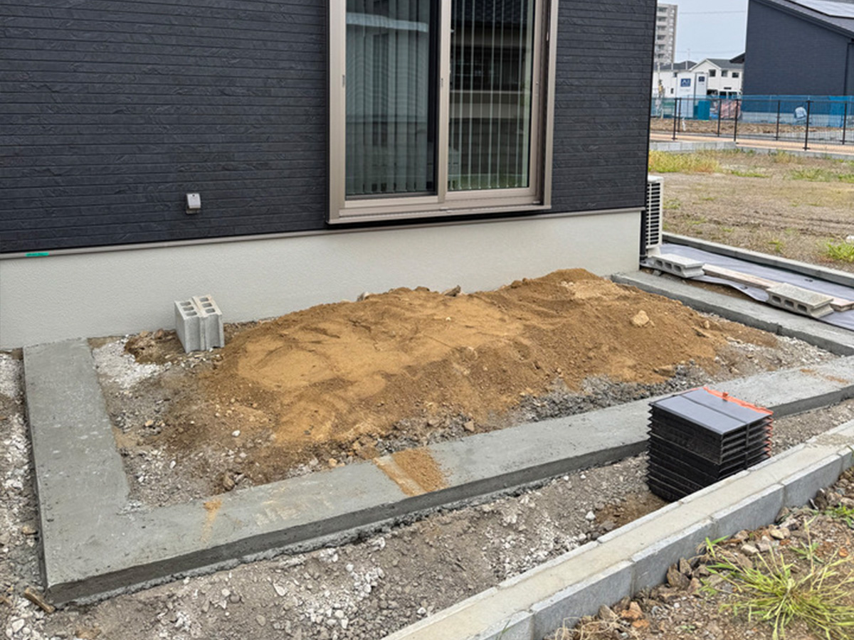 窓の外が土のままで、室内への砂埃や段差の使いにくさが課題でした。