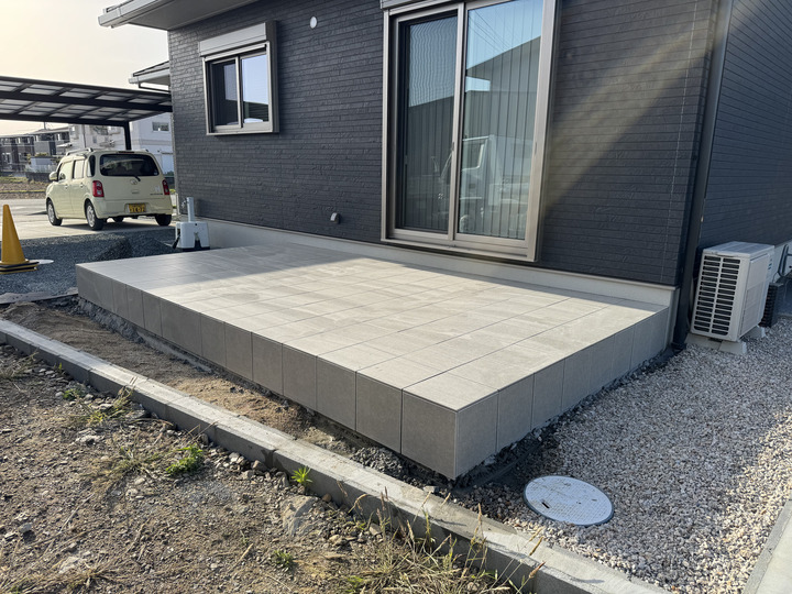 フラットで使いやすいタイルデッキを設置。あえて高さを低くすることで転落・怪我防止、お子様はもちろん、ご家族様が安心安全に使用できる空間です。