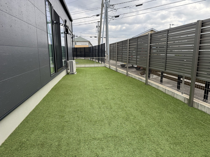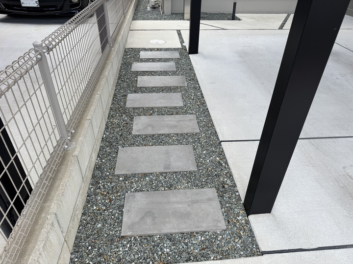 また、お庭部分は手入れの負担を最小限に抑えつつ、お子様やペットが安心して遊べるよう高品質な人工芝を施工。玄関へのアプローチには、歩きやすさと高級感を両立させたストーン風のステップを配置し、機能美を追求した空間に仕上げました。