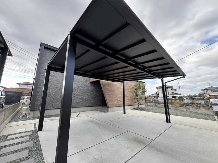 建物と色味を合わせた黒のカーポートを設置。機能性はもちろん、住まい全体の質感を高めるシックな仕上がりです。