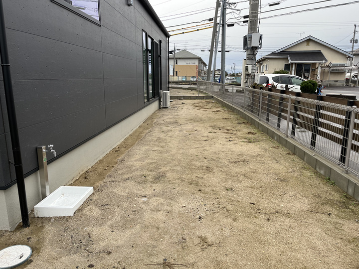 建物横の土のスペース。雑草対策や、隣地とのプライバシー確保が課題でした。
