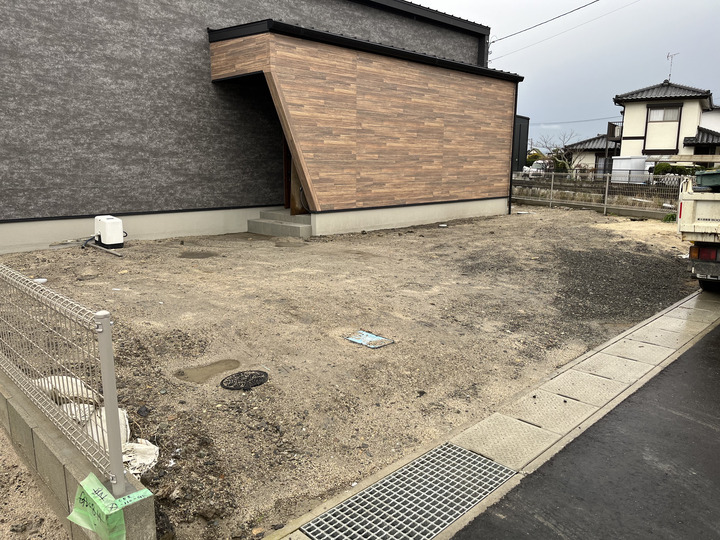 工事前の土の状態。建物の存在感に負けない、しっかりとした駐車空間が必要でした。