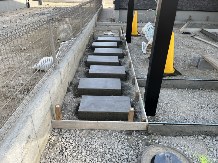 玄関前の段差を整えている段階です。毎日通る場所だからこそ、足元の安定感とデザイン性が求められます。
