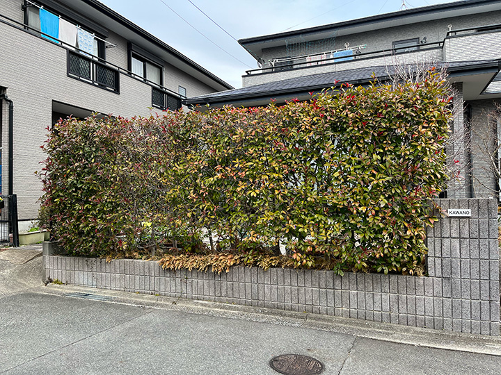 高く育った生垣。プライバシーは守れるものの、毎年の剪定や落ち葉の掃除が大きな負担となっていました。