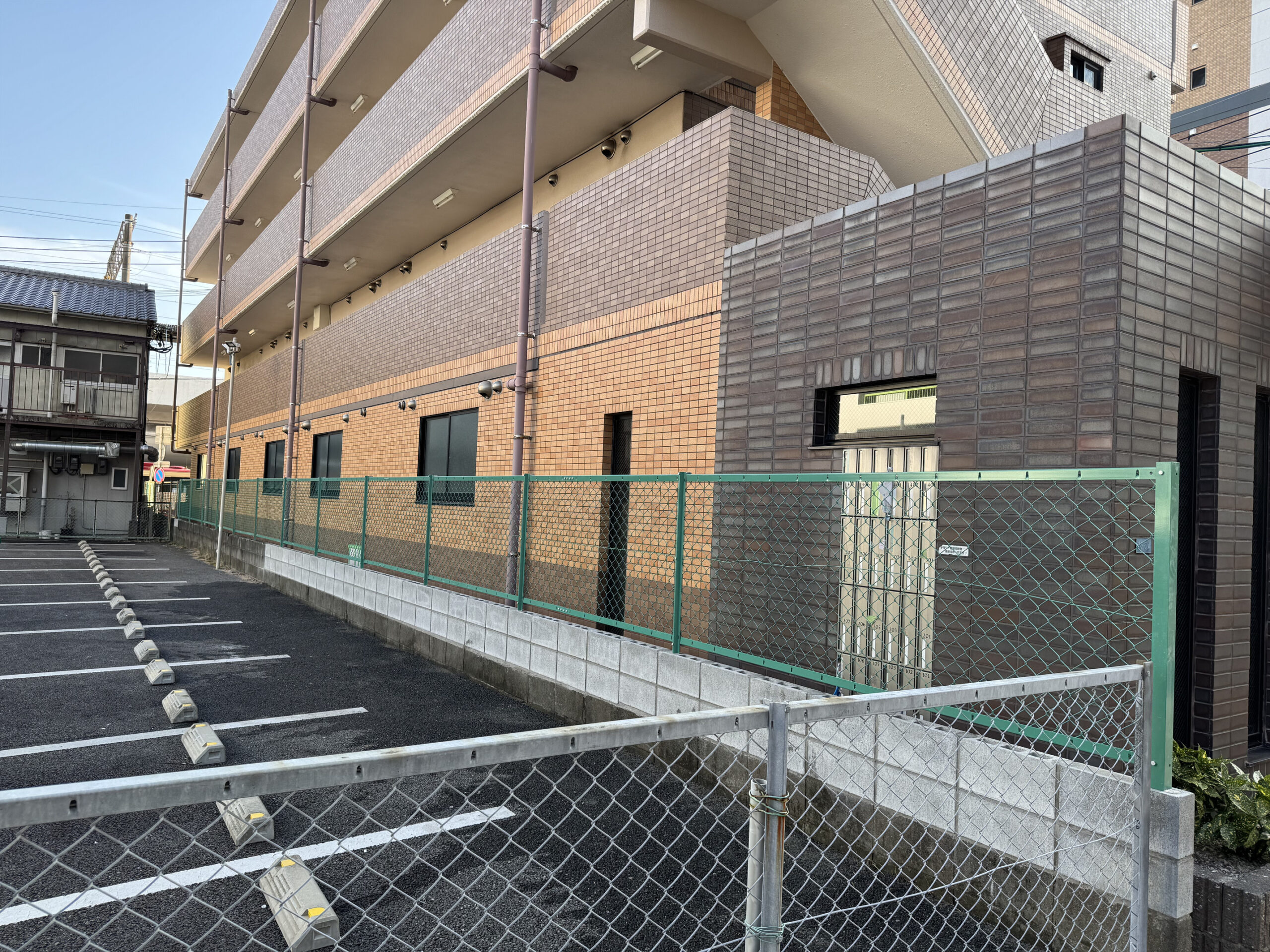 今回は、コストパフォーマンスに優れ、圧迫感を与えないグリーンのメッシュフェンスを採用。周囲の駐車場やレンガ調の外壁とも相性が良く、視認性を確保しながらもしっかりと敷地をガードします。