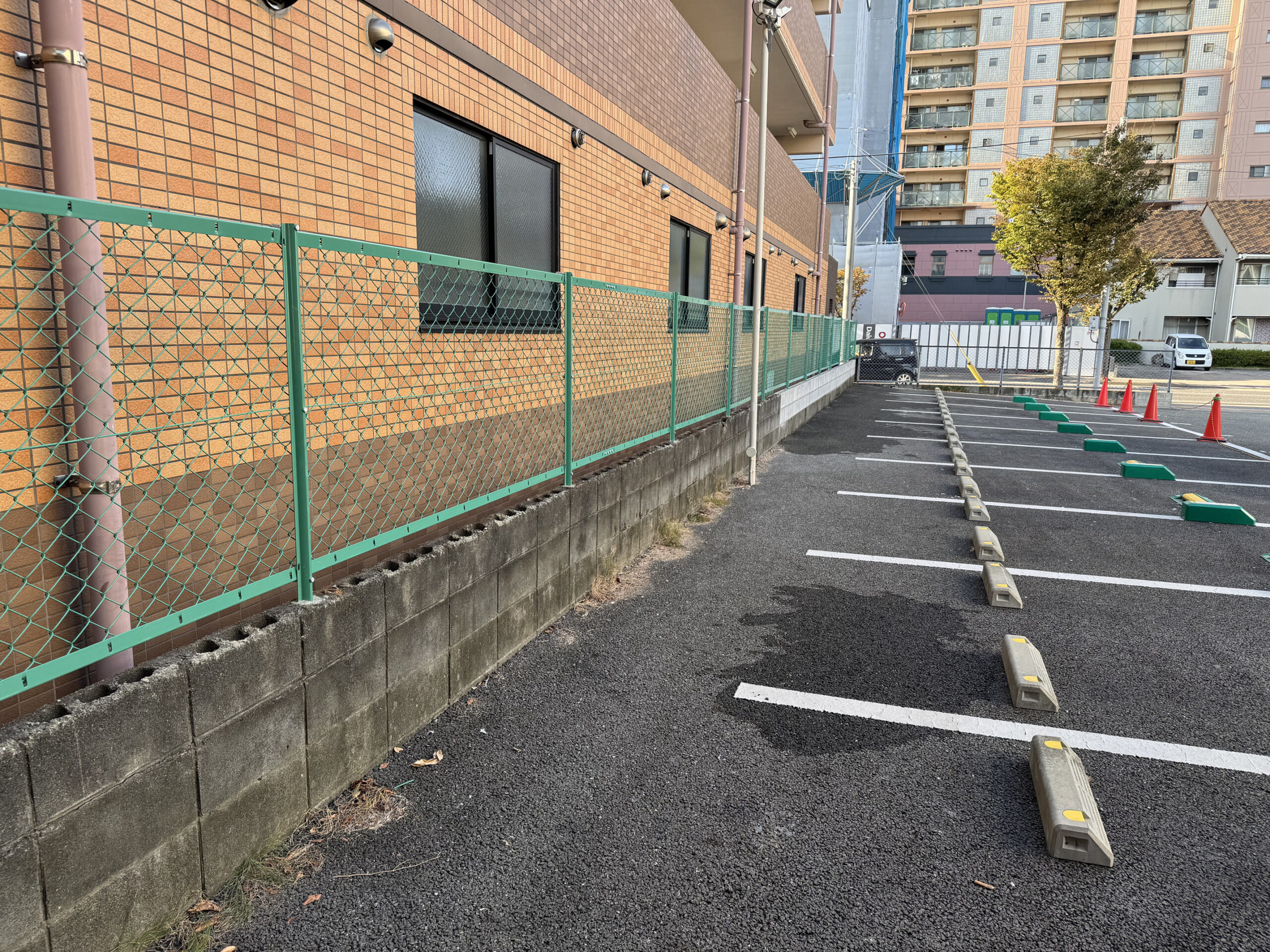 鮮やかなグリーンのフェンスを直線美にこだわり設置。敷地の境界が明確になり、駐車場利用者にとっても安心できる環境に整いました。