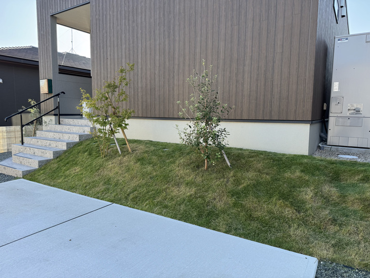 また、法面(斜面)部分には芝生とシンボルツリーを配置。無機質になりがちな外構に自然の柔らかさをプラスし、眺望の良さを活かしつつ、建物の個性が際立つデザインに仕上げました。